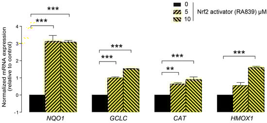Pharmacological activation of NRF2 induced the expression of NRF2 target genes. The 4T1 cells were treated with the NRF2 activator, RA839, in the concentrations indicated for 48 h, then the expressions of NRF2 target genes, NQO1, GCLC, CAT, and HMOX1, were determined using RT-qPCR (n = 3). Abbreviations: NAD(P)H quinone dehydrogenase 1 (NQO1), glutamate–cysteine ligase catalytic subunit (GCLC), catalase (CAT), and heme oxygenase 1 (HMOX1). Data are plotted as mean ± SD. ** and *** indicate statistically significant differences between control and RA839-treated groups at p < 0.01 or p < 0.001, respectively.