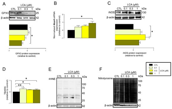 The previous results suggested that LCA treatment may impair cellular antioxidant defenses. In line with that, we found that the protein expression of glutathione peroxidase-3 (GPX3), a key antioxidant protein, decreased upon LCA treatment (Figure 4A). Oxidative stress is an imbalance between antioxidant and pro-oxidant genes. Thus, we assessed whether LCA can induce expression of pro-oxidant genes. LCA induced the mRNA expression of NADPH oxidase 4 (NOX4), a major ROS producing enzyme (Figure 4B), and inducible NO synthase (iNOS), a major source of nitric oxide in cells (Figure 4C).
