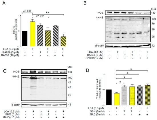NRF2 activation modulated LCA-induced oxidative stress responses in 4T1 breast cancer cells. The 4T1 cells were treated with 0.3 μm LCA and the NRF2 activator RA839 or tBHQ in the concentrations indicated for 48 h. Lipid peroxidation was determined by measuring (A) TBARS (n = 4) and (B,C) 4-HNE levels using western blotting (n = 3). (D) The 4T1 cells were treated with LCA (0.3 μm) and/or GSH and NAC (both at 5 mm) antioxidants for 48 h, then total protein concentration was determined using the sulforhodamine B assay (n = 3). For statistical analysis ANOVA test was used followed by the Dunnett post-hoc test, where all groups were compared to the LCA-treated cohort. Data are plotted as mean ± SEM. ** p < 0.01, LCA vs. LCA/NRF2-activator-treated groups (GSH, reduced glutathione; LCA, lithocholic acid; NAC, N-acetylcysteine; TBARS, thiobarbituric acid reactive substances; 4HNE, 4-hydroxynonenal).