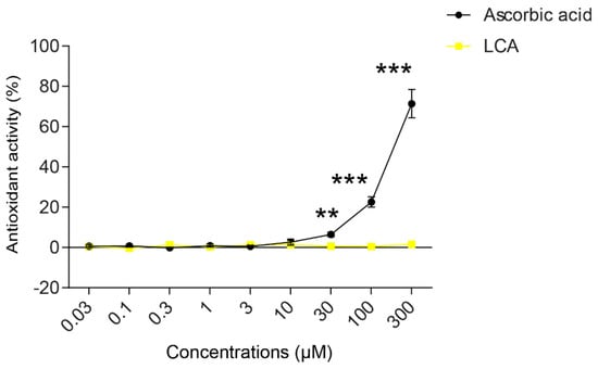 LCA did not act as an antioxidant. The ABTS radical scavenging assay was done in 96-well plates using triplicate samples. LCA was tested in a concentration range of 0.03–300 μm. Ascorbic acid was used as a positive control. Antioxidant activity was expressed as the percentage of control samples. Means of three independent experiments ± SD are presented. ** and *** indicate a statistically significant difference between control and ascorbic acid-treated groups at p < 0.01 or p < 0.001, respectively.