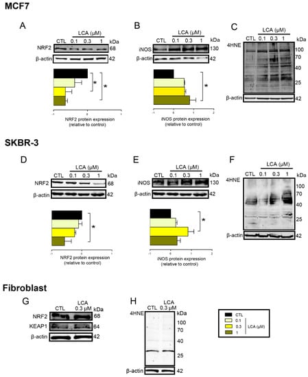 LCA induced oxidative stress in MCF7 and SKBR-3 human breast cancer cell lines, but not in primary fibroblasts. (A–C) The MCF7 cells were treated with LCA in the concentrations indicated for 48 h, then (A) NRF2, (B) iNOS protein expression, and (C) 4HNE were determined by western blotting (n = 3). (D–F) The SKBR3 cells were treated with LCA for 48 h, then (D) NRF2, (E) iNOS, and (b) 4HNE expressions were determined by western blotting (n = 3). Upper panels: representative figures. Lower panels: densitometric analysis of western blots. In the case of 4HNE, similar data were obtained in three independent experiments. (G,H) Fibroblast cells were treated with 0.3 µm LCA for 48 h then (G) NRF2, KEAP1, and (H) 4HNE expressions were determined by western blotting. Data are plotted as mean ± SEM. * p < 0.05, control vs. LCA-treated. (LCA, lithocholic acid; NRF2, nuclear factor, erythroid 2-like 2; 4HNE, 4-hydroxynonenal; iNOS, inducible nitric oxide synthase).