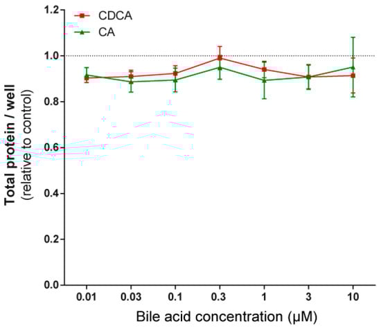 Primary bile acids did not affect the proliferation of 4T1 breast cancer cells. The 4T1 cells were treated with CA and CDCA in the concentrations indicated for 48 h, then total protein concentrations were determined by sulforhodamine B assay (n = 4). Data are plotted as mean ± SEM. (CA, cholic acid; CDCA, chenodeoxycholic acid).