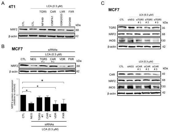 LCA-induced oxidative stress responses were mediated by TGR5 and by CAR receptors. (A) The 4T1 cells were treated with 0.3 μm LCA and NF449, CINPA1, DY268, or GSK2033 at a final concentration of 5 μm for 48 h, then NRF2 protein expression was detected using western blotting (representative figure, n = 2). (B,C) TGR5, CAR, VDR, and PXR bile acid receptors were silenced in MCF7 cells by transiently transfecting the cells with the corresponding siRNA or a negative control siRNA. After 48 h, protein expressions of (B,C) NRF2 and (C) iNOS were determined by western blotting (n = 3). Data are plotted as mean ± SEM. * p < 0.05, control vs. LCA/siRNA treated. (CAR, constitutive androstane receptor; FXR, farnesoid X-activated receptor; LCA, lithocholic acid; LXR, liver X nuclear receptor; NRF2, nuclear factor, erythroid 2-like 2; TGR5/GPBAR1, G protein-coupled bile acid receptor 1/Takeda G-protein coupled receptor; VDR, vitamin D receptor).
