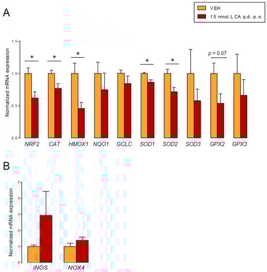 LCA modulated the expression level of antioxidant and pro-oxidant genes in vivo. (A,B) Female Balb/c mice were grafted with 4T1 cells and treated with LCA (15 nmol q.d. p.o.) or vehicle (VEH) (n = 5/5) for 18 days. The mRNA expression levels of the indicated genes were determined in tumors using RT-qPCR. Error is depicted as SEM. * indicates statistically significant differences between vehicle and treated groups at p < 0.05. (CAT, catalase; GCLC, glutamate–cysteine ligase catalytic subunit; GPX2, glutathione peroxidase 2; GPX3, glutathione peroxidase 3; HMOX1, heme oxygenase 1; iNOS, inducible NO synthase; NOX4, NADPH oxidase 4; NQO1, NAD(P)H quinone dehydrogenase 1; NRF2, nuclear factor, erythroid 2-like 2; SOD1, superoxide dismutase 1; SOD2, superoxide dismutase 2; SOD3, superoxide dismutase 3).