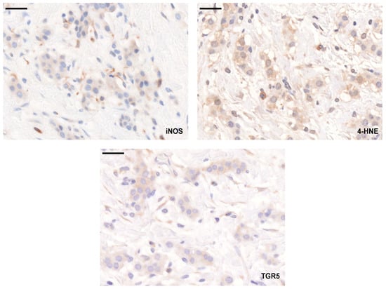We assessed the expression of the LCA-elicited oxidative/nitrosative stress markers (TGR5, iNOS, and 4HNE) using a tissue microarray (TMA) made up of tumor samples from 88 breast cancer patients. In parallel, we assessed the available public expression databases, GEO Profiles (https://www.ncbi.nlm.nih.gov/geoprofiles/) and kmplot.com [50]. The typical staining pattern of the antibodies is shown in Figure 11.