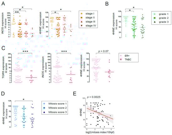 LCA-induced oxidative stress pathway is protective in human breast cancer. (A–D) The expression levels of oxidative/nitrosative stress markers were analyzed in tumor samples of 88 breast cancer patients using tissue microarray (TMA), as indicated on the graphs. (A) Patients were stratified based on disease stage (Stage I–IV), (B) pathological grade of the disease (Grade 1–3), (C) ER+ vs. TNBC cases, and (D) mitosis score (mitosis score 1–3), and the expression level of indicated markers were determined using IHC analysis. (E) Linear regression analyses for the correlation between 4HNE expression levels and the mitotic index were determined using R project. TGR5: Pearson r = −0.13; p = 0.26; iNOS: Pearson r = −0.16; p = 0.16; 4HNE: Pearson r = −0.34; p = 0.0025. Line represents linear regression of data (TGR5: y = 25 − 3x; iNOS: y = 38 − 4.7x; 4HNE: y = 78 − 7x). *, **, and *** indicate p < 0.05, p < 0.01 or p < 0.001, differences between patient groups. (TGR5/GPBAR1, G protein-coupled bile acid receptor 1/Takeda G-protein coupled receptor; 4HNE, 4-hydroxynonenal).