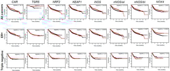 The components of the LCA–TGR/CAR pathway are protective in human breast cancer. The impact of CAR, TGR5, NRF2, KEAP1, iNOS, nNOS, and NOX4 expression on survival in breast cancer patients was evaluated by assessing the kmplot.com database. All cancers, ER+, and triple negative cases were analyzed. The ER+ population also included those patients where ER status was derived from gene expression data. Triple negative cases included patients with ER− status (including those patients where ER status was derived from gene expression data), PR− status, and HER2− status. The red line indicates high expression while the black line indicates low expression. Probe IDs, numbers at risk, and hazard ratios are collected in Table 5. nNOS(a) represents 207309_at probe id, while nNOS(b) represents 207310_at probe set. * indicates that grade 1 patients are depicted. (CAR, constitutive androstane receptor; ER, estrogen receptor; KEAP1, Kelch-like ECH associating protein 1; NOX4, NADPH oxidase 4; NRF2, nuclear factor, erythroid 2-like 2; TGR5/GPBAR1, G protein-coupled bile acid receptor 1/Takeda G-protein coupled receptor; iNOS, inducible nitric oxide synthase; nNOS, neuronal nitric oxide synthase).