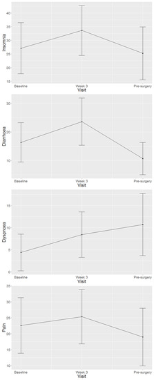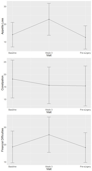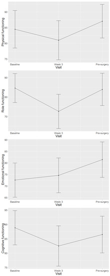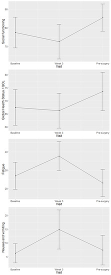 Line graphs illustrating the health-related quality of life scores at baseline, week three of treatment and pre-surgery for each domain. Means and confidence intervals are shown.