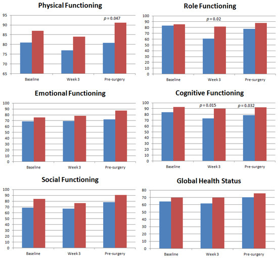 For functional scales, the Caucasian group on average had higher scores at baseline and a marked improvement pre-surgery while the Asian group had consistently lower scores and did not improve pre-surgery. Statistically and clinically significant pair-wise comparisons were evident in physical functioning at pre-surgery, role functioning at week three and in cognitive function at week three and pre-surgery.