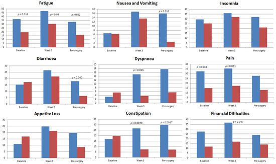 Fatigue and nausea/vomiting increased significantly during treatment (p = 0.015 and p = 0.026 respectively). Symptoms of fatigue, appetite loss, diarrhoea and financial difficulties improved from treatment to pre-surgery (p = 0.001, p = 0.035, p = 0.0026 and p = 0.018 respectively). Cognitive and role function worsened significantly during treatment (p = 0.043 and p = 0.02 respectively). The latter improved significantly from treatment to pre-surgery (p = 0.03). Emotional functioning improved significantly from baseline to pre-surgery (p = 0.049). Social functioning worsened during treatment but improved significantly from both baseline and treatment levels to pre-surgery (p = 0.0078 and p = 0.019 respectively). All these changes were clinically important (Table S1) [22].