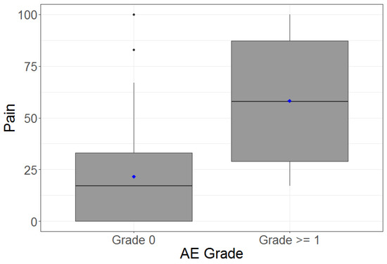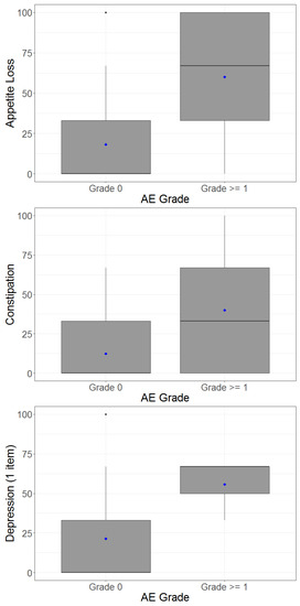 Box and whisker plots showing the patient-reported outcomes on the y-axis plotted against clinician-reported adverse events on the x-axis, grouped into grade 0 or grade ≥1. The boxes represent means (bold lines), upper and lower quartile scores while whiskers represent the maximum and minimum scores.