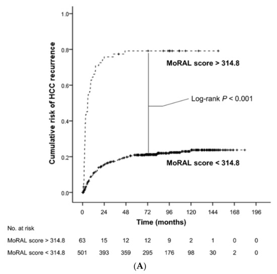 The following are available online at https://www.mdpi.com/2072-6694/11/9/1295/s1, Table S1: C-indices for predicting HCC recurrence by various models in the beyond-MC and within-MC subcohorts, Table S2: Comparison of the area under the ROC curve for predicting 1-year, 3-year, and 5-year HCC recurrence by various predicting models in the beyond-MC subcohort, Table S3: Comparison of the area under the ROC curve for predicting 1-year, 3-year, and 5-year HCC recurrence various predicting models in the within-MC subcohort, Table S4: C-indices for predicting overall survival by various models in the beyond-MC and within-MC subcohort, Figure S1: Kaplan-Meier estimates of cumulative risk of HCC recurrence according to the MoRAL score in the beyond-MC subcohort, Figure S2: Kaplan-Meier estimates of overall survival according to the MoRAL score in the beyond-MC subcohort, Figure S3: Kaplan-Meier estimates of cumulative risk of HCC recurrence according to the MoRAL score in the within-MC subcohort, Figure S4: Kaplan-Meier estimates of overall survival according to the MoRAL score in the within-MC subcohort.