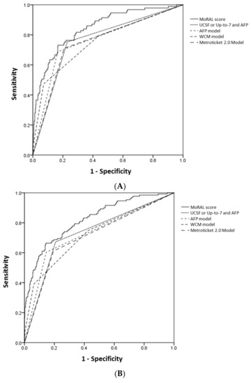 The Milan criteria was selected because it is still a current standard of care in LT. Among various alternative criteria other than the MC, externally validated criteria either, in the seminal publication or subsequent studies, were adopted for comparison [22]. In addition, the most recently suggested prognostic model by the WCM group was also compared. To avoid confusion, the MORAL score, developed by the WCM group, was designated as WCM model in this article.