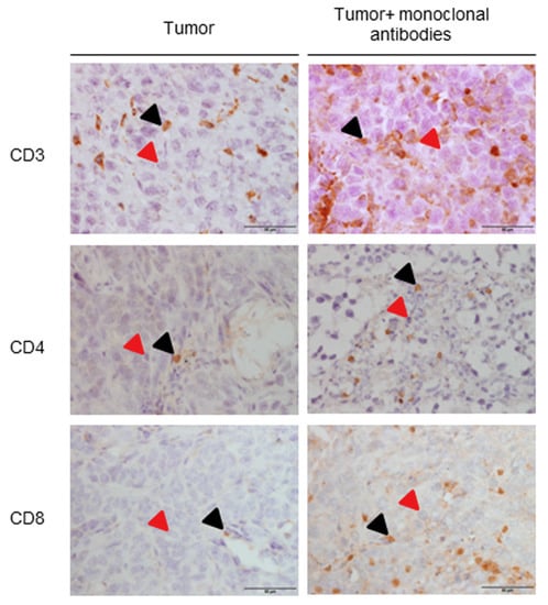 Representative examples of immunohistochemistry staining for CD3, CD4, and CD8, in tumor samples of the different study groups of mice. All types of T cells (CD3, CD8, and CD4) are stained in brown color (black arrows), while negative nuclei are stained in purple color (red arrows).