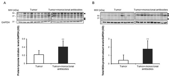 Compared to non-treated mice, protein tyrosine nitration and oxidation (MDA-protein adducts) and cytosolic SOD1 levels were significantly greater in the tumors of the mice treated with the monoclonal antibodies, while no significant differences were detected in mitochondrial SOD2 or catalase protein levels between the two study groups (Figure 4A,B and Figure 5A–C).