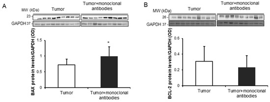 Oxidative stress may also trigger several important cellular pathways such as cell death, apoptosis, and autophagy through signaling pathways such as the redox sensitive NF-κB pathway. In this regard, the ratio levels of active p65 (phosphorylated) to total p65 were greater in the tumors of animals treated with the monoclonal antibodies than in the non-treated mice. Importantly, levels of TUNEL-positive nuclei were also significantly increased in tumors of the mice treated with the immunomodulators. Additionally, Bax protein levels also increased in the tumors of mice treated with the monoclonal antibodies, while no differences in Bcl2 levels were seen between the study groups. These results are consistent with those previously reported, in which different therapeutic strategies also elicited a rise in proapoptotic markers [12,33]. The increase in apoptotic markers of cancer cells was also demonstrated in previous investigations in which the animals were treated with selective inhibitors of PARP activity [44,48,49,50].