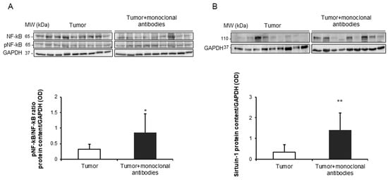 Protein levels of the ratio of p-p65 subunit to total p65 of the NF-κB signaling pathway were significantly greater in the tumors of the mice treated with the monoclonal antibodies than in those of non-treated rodents (Figure 8A). Protein levels of the deacetylase sirtuin-1 were significantly increased in the tumors of the treated mice compared to non-treated animals (Figure 8B).