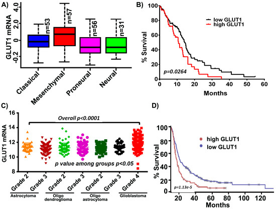 Increased levels of GLUT1 have been demonstrated in GBM and its inhibition has been shown to increase the effectiveness of temozolomide, a current standard of care in GBM [35]. It is also reported that tumor cells from the enhancing region showed high expression of mesenchymal genes including GLUT1 in the necrotic/hypoxic region [36]. We, therefore, started by assessing if an increase in GLUT1 expression was characteristic in GBM patients by using a data mining approach. Using the data obtained from the TCGA GBM cohort and glioblastoma bio discovery portal [37], we compared the mRNA expression of GLUT1 across GBM subtypes. Of these subtypes, the mesenchymal subtype demonstrated the highest mRNA levels of GLUT1, in comparison to proneural, classical and neural subtypes (Figure 1A). Next, when the aggregated patient population from the GBM dataset was dichotomized into those who expressed more GLUT1 than the sample median and those who expressed less GLUT1 than the median, the high-GLUT1 group demonstrated worse survivorship (Figure 1B). Next, we assessed the expression of GLUT1 across all the WHO grade diffuse glioma (astrocytoma, oligodendroglioma, oligoastrocytoma and glioblastoma). High expression levels of GLUT1 (p < 0.0001) were observed in glioblastoma when compared to the low grade tumors, indicative of GLUT’s possible role in tumor aggressiveness (Figure 1C). Using the Project Betastasis, we next examined the clinical outcomes of GLUT1 in long-term GBM survivors. The Kaplan–Meier data obtained from the REMBRANT glioblastoma cohort of 329 cases showed that patients with high GLUT1 expression had a shorter overall survival when compared to the low GLUT1 expression. This data suggest that GLUT1 may be potential target in glioblastoma, however it is not clear if the expression of GLUT1 contributes to the mesenchymal subtype (Figure 1D).
