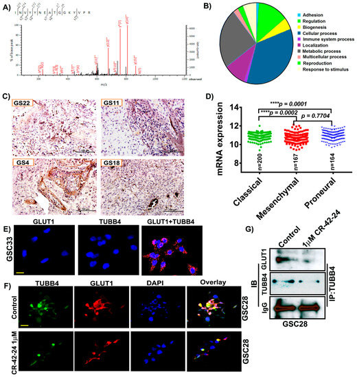 To identify the binding partners and possible regulators of GLUT1, we performed LC/MS analysis on a GS4 hGBM specimen. Annotation of the LC/MS result was performed on the Mascot server and demonstrated a high probability of association with TUBB4 based on the ionic residues shown (Figure 3A). The binding score was calculated to be 23.2 with a binding energy of −0.0019. The TUBB4 sequence INVYYNEATGGKYVPR obtained upon GLUT1 binding is verified and was correlated to TUBB4 from NCBI. In silico analysis performed using pantherdb (www.pantherdb.org) software also verified GLUT1’s involvement in a variety of signaling pathways including cell adhesion (2%), metabolic process (28%) and cellular process (41%; Figure 3B). As our LC/MS confirmed the association of GLUT1-TUBB4, we next checked the expression of TUBB4 in our hGBM specimens using an immunohistochemical analysis. The staining results showed high expression of TUBB4 in GS22, GS11, GS4 and GS18 specimens (Figure 3C). TCGA analysis generated using mRNA expression of TUBB4 showed that TUBB4 expression is high in the mesenchymal subtype when compared to classical and proneural subtypes. These results are comparable to the expression profile of GLUT1 (Figure 3D). To further confirm the association of GLUT1 and TUBB4 we next asked if a proximity ligation assay (PLA) could detect a direct association between GLUT1 and TUBB4 in GSC33 cells. We observed a PLA signal of high intensity in the presence of both GLUT1 and TUBB4 (Figure 3E) confirming their association (red spots). The PLA for only GLUT1 or only TUBB4 showed no signal. We next performed the immunofluorescence experiment and observed that both TUBB4 and GLUT1 associated with each other in the untreated GSC28 cells and upon treatment with 1 µM CR-42-24, their expression levels were reduced and so was their association (Figure 3F). Next, we performed immunoprecipitation experiments to confirm the interaction between GLUT1 and TUBB4. GSC28 control and treated cells with 1 µM CR-42-24 were subjected to immunoprecipitation using the TUBB4 antibody. The immunoblot analysis performed on the eluates of TUBB4 immunoprecipitated samples using GLUT1 antibody confirmed their interaction. These results confirmed that GLUT1 and TUBB4 physically associated and interacted in GSC (Figure 3G).