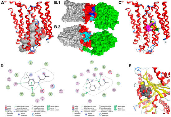 Docking studies of GLUT1-TUBB4. (A) Alpha spheres (grey and red spheres) obtained by applying molecular operating environment’s (MOE’s) Site Finder tool on the crystal structure of the human GLUT1 (Deng et al. 2014; PDB ID 4PYP) accounting for the most probable binding pocket. The binding region includes 69 residues, many of them being deeply buried within the channel. Contact atoms of the protein are highlighted in pink. (B1,B2) The molecular surface representation of the TUBB4-GLUT1 complex after 50 ns. TUBB4 is shown in green, the cytoplasmic domain of GLUT1 is red and both the transmembrane and extracellular domains of GLUT1 are shown in grey. Residues at the top channel opening are shown in blue while residues at the opening near the transmembrane domain are colored in cyan. At this predicted position, TUBB4 (green) occludes the top opening in the GLUT1 channel. (C) Most probable poses of fasentin as predicted from the 1st (green), 2nd (yellow) and 3rd (pink) most populated clusters. (D) Interaction diagrams of the most probable poses of fasentin as predicted from the 1st (top) and 3rd (bottom) most populated clusters. (E) Docking model of CR-42-24 and TUBB.