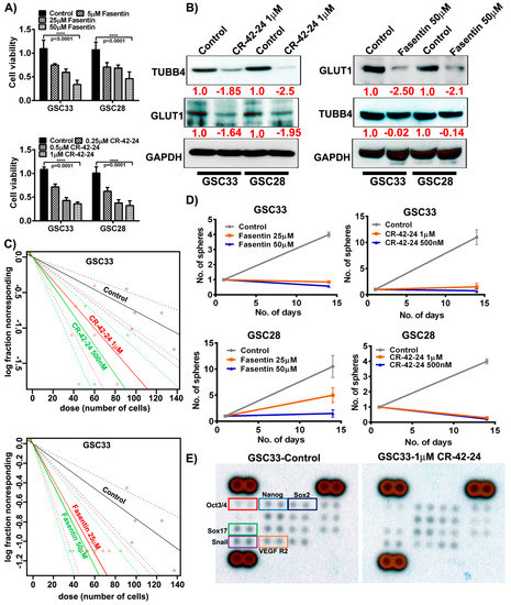 Total protein extracts from various treatments were resolved by 10% SDS-PAGE (sodium dodecyl sulfate- polyacrylamide gel electrophoresis) transferred to nitrocellulose membrane and were blocked in Tris-HCl, pH 7.5, 500 mM NaCl, 0.1% Tween 20 and 5% nonfat milk. Then blots were incubated with GLUT1 (1:500; Novus Bio, CO, USA), TUBB4 (1:1000; Abcam) and GAPDH (1:1000; Santa Cruz Biotechnologies) primary antibodies, and subsequently incubated with 1:2000 dilution of species-specific, horseradish peroxidase (HRP)-conjugated secondary antibody. Imaging and data analysis were carried out using enhanced chemiluminescence (ECL) Western blotting detection reagents on Hyperfilm-MP autoradiography film. The GAPDH antibody was used to verify equal loading of proteins in all lanes. Approximately 300 µg of total protein cell lysates from both untreated and 1µM CR-42-24 GSC28 cells were incubated with 50 µL of protein G beads (Miltenyi Biotech) followed by 2 µg of TUBB4 antibody with end-to-end rotation overnight as described previously [20]. The obtained eluates were verified for the expression of GLUT1 and TUBB4. IgG is shown as a loading control. Around 300 µg of control and 1 µM CR-42-24 treated total cell lysates from GSC28 cells were subjected to human pluripotent stem cell array by following the manufacturer’s instructions. RT-PCR was conducted from the total RNA isolated from the hGBM specimens using the SYBR green method. The primers used in the study were GLUT1 sense 5′-TCGTCGGCATCCTCATCGCC-3′ and antisense 5′-CCGGTTCTCCTCGTTGCGGT; GAPDH sense 5′-AATCCCATCACCATCTTCCA-3′ and antisense 5′-TGGACTCCACGACGTACTCA-3′. The original pictures of Western blotting can be found in Supplementary Materials.