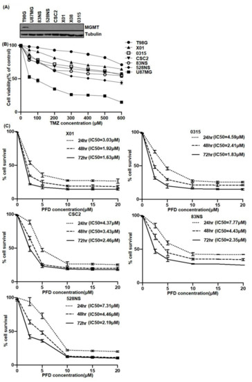 The following are available online at https://www.mdpi.com/2072-6694/11/9/1310/s1, Figure S1: Viability of PFD and TMZ combination treatment in T98G, X01, 0315, CSC2 cells, Figure S2: Additional image of Western blot shown in Figure 1A and densitometry ratio of each band, Figure S3: Additional image of Western blot shown in Figure 2E and densitometry ratio of each band, Figure S4: Additional image of Western blot shown in Figure 3E and densitometry ratio of each band, Figure S5: Additional image of Western blot shown in Figure 4B,D and densitometry ratio of each band.
