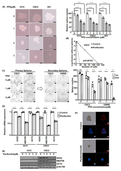 Tumorsphere formation assays were performed in a manner similar to our prior report [21]. Tumor spheres of 0315, 528NS, CSC2, and X01 cells were maintained in DMEM/F-12, B-27 supplement, 10 ng/mL recombinant human bFGF, and 20 ng/mL recombinant human EGF, and 20 UI/mL penicillin and 20 μg/mL streptomycin. Sphere-forming cells were plated on 6-well culture plate. Spheres were collected from culture plate along with media. Sphere pellet was formed by centrifugation, re-suspended in Accutase (Gibco), and placed in the incubator for 3 min. Pellet was pipetted to break the tumor spheres. Cells were counted, and approximately 1 × 105 cells per well were plated on 6-well plate. After incubation, cells from tumor sphere were treated with 0, 1, 2, and 3 μM PFD for another 48 h. Images were obtained using phase-contrast microscopy. For in vitro limiting dilution assay, GSCs with decreasing numbers of cells (100, 50, 25, 12, 6, and 3) per well plated in 96-well plates containing DMEM/F-12 with B27, EGF (10 ng/mL), and bFGF (5 ng/mL) were used. Extreme limiting dilution analysis was performed using software available at http://bioinf.wehi.edu.au/software/elda/ [38].