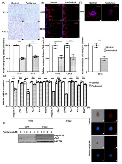 It is known that one of the typical characteristics of GSCs is tumor cell invasion into the adjacent normal brain parenchyme, which is recapitulated in the animal model [9]. Previously, we identified that X01, 0315, and CSC2 cells had high invasive features, whereas 83NS and 528NS revealed a low invasiveness potential [21]. Therefore, by using highly invasive CSC2 and 0315 GSCs, the effects of PFD on cell migration and invasion were examined by Transwell assay. Migration of PFD-treated 0315 and CSC2 cells was significantly delayed by 50% and 45%, respectively, as compared to control cells (Figure 3A, p ≤ 0.001). Then, we examined GSC invasion by a Matrigel-coated microfluidic device. The control 0315 and CSC2 GSCs collectively invaded the Matrigel barrier, as opposed to single cell invasion. In addition, the cell morphology showed a spindle shape with mesenchymal-like features. However, PFD treatment reduced the invasion distance by 45% and 46% in 0315 and CSC2 cells, respectively (Figure 3B, ** p ≤ 0.01, *** p ≤ 0.001). For 3D invasion assays, we implanted 0315 GSC spheres in a Matrigel matrix. The implanted 0315 GSC sphere migrated radially into the Matrigel matrix, exhibiting an in vivo tumor behavior. After 72 h of treatment with 2 µM PFD, invasion from the tumor sphere exhibited a 48% decrease compared to the untreated 0315 GSCs (Figure 3C). To further confirm these observations, we examined various invasion-related molecules. We identified that the PFD treatment reduced expression of Integrin α6 and uPAR in CSC2 and 0315 GSCs at mRNA and protein levels (Figure 3D,E). In addition, the immunofluorescence analysis revealed the reduction of uPAR expression by 3 µM PFD treatment in CSC2 sphere-forming cells (Figure 3F).