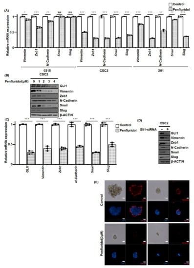 Epithelial-mesenchymal transition (EMT) is strongly associated with increased cell motility as well as resistance to genotoxic agents, which are typical characteristics of GSCs [22]. Previously, we found that PFD inhibits GSC proliferation and invasion, suggesting that PFD may suppress EMT factors. To elucidate the effect of PFD on EMT factors, we examined mRNA expression of GSCs 0315, CSC2, and X01 after 2 μM PFD treatment. Interestingly, PFD decreased the mRNA levels of vimentin, Zeb1, N-cadherin, Snail, and Slug, depending on the GSC type (Figure 4A). In addition, the western blot analysis identified decreased expression of EMT markers following PFD treatment (Figure 4B). Furthermore, we established GLI1 as a regulator of EMT factors. PFD inhibited GLI1 expression in a dose-dependent manner (Figure 4B). To identify GLI1 as a regulator of EMT factors in GSCs, it was knocked down in CSC2 cells by GLI1 siRNA. We identified that knockdown of GLI1 caused reduction in the mRNA and protein levels of vimentin, Zeb1, N-cadherin, Snail, and Slug in CSC2 cells (Figure 4C,D). These findings also confirmed the results of immunofluorescence staining, which showed that PFD decreased GLI1 and vimentin expression (Figure 4E).