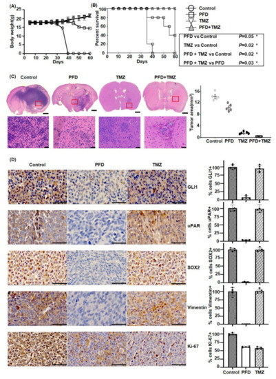 The antitumor effect of PFD was further evaluated in combination with TMZ in a mouse orthotopic xenograft model. We implanted 1 × 104 CSC2 cells into the brain parenchyma of nude mice. Two days later, mice were randomly divided into four groups (n = 5 mice/group): control, PFD, TMZ, and PFD combined with TMZ. PFD was administered daily, 0.8 mg/kg/week, by oral gavage for 28 days, TMZ was orally administered a dosage of 33 mg/kg/3 days per week, for 28 days; the PFD and TMZ combined treatment group was also administered the same dose, whereas mice in the control group received normal saline only during the experimental period (until day 60). Weight of mice was measured every 5 days (Figure 5A). We identified that all the mice survived for 60 days in TMZ-treated and the combined treatment group, compared with only 36 days in the control group, and 52 days in the PFD group (Figure 5B). To investigate whether PFD combined with TMZ inhibits CSC2 growth in vivo, we measured tumor volumes in xenograft models. The PFD treatment group showed decreased invasion and 30% reduced tumor volume compared to control. In addition, the combined treatment group inhibited all growth, and tumors disappeared in mice altogether, although the TMZ treatment group revealed 80% decrease in size of tumors (Figure 5C). To determine the robust effect of combined therapy, we performed immunohistochemical staining for the expression of GLI1, uPAR, SOX2, Vimentin, and Ki-67 in each group (Figure 5D). Interestingly, the residual tumors in the TMZ treatment group revealed the expression of GLI1, uPAR, SOX2, Vimentin, in contrast to the PFD treatment group. But, Ki-67 expression is similar in both group.