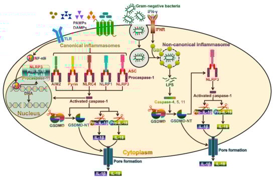 Pyroptosis, a pro-inflammatory form of cell death, is generally induced by intracellular pathogen infection and forms part of the host defense system []. Pyroptosis can be induced via two pathways, the canonical and non-canonical inflammasome pathways (Figure 1). Canonical pyroptosis is executed by caspase-1, which is triggered by a number of pathogen-associated molecular patterns (PAMPs) and damage-associated molecular patterns (DAMPs), while non-canonical pyroptosis is dependent on human caspase-4/-5 or mouse caspase-11 and can be induced by intracellular LPS []. The morphological features of caspase-1-dependent pyroptosis and caspase-1-independent pyroptosis are similar. Both are characterized by the loss of cellular membrane integrity, chromatin condensation and DNA fragmentation. Specially, the cellular membrane undergoes rupture, resealing and swelling, and forms a balloon-shaped vesicle around the nucleus []. The cellular membrane becomes disrupted, and the cytoplasmic materials, including pro-inflammatory cytokines, endogenous DAMPs and alarmins, are released into the extracellular space [].