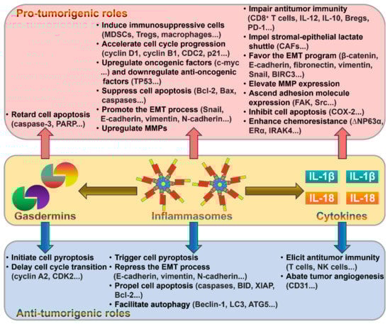 - Van Gorp, H.; Lamkanfi, M. The emerging roles of inflammasome-dependent cytokines in cancer development. EMBO Rep. 2019, 20. [Google Scholar] [CrossRef]