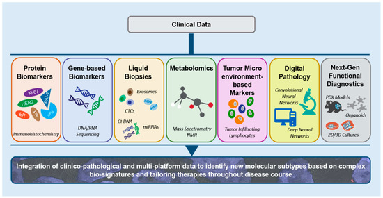 An overview of the various data generating hubs that allows integration of clinico-pathological and multi-omics data. This wealth of information can be meaningfully mined to identify new molecular subtypes based on complex multi-omics generated bio-signatures that can facilitate tailored therapies throughout the disease course in breast cancer patients.