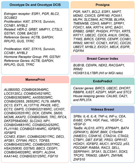 Many currently available prognostic and predictive tests in breast oncology utilize genomic and gene expression-based biomarkers, a trend that was spurred by the continually decreasing costs of whole-genome, gene panel, and RNA sequencing, and that requires only small sample volumes for processing. Multigene assays often interrogate one or more pathways that drive tumor biology, and predict the natural progression of the disease (with or without therapeutic intervention) based on its inherent aggressiveness. Thus, these tests help distinguish patients who need more aggressive treatments from those for whom the current standard-of-care may suffice, reducing healthcare expenditures. Several multigene tests (MGTs) are now routinely used in the clinical setting, and have been described in previous literature [20,21,22,23,24,25,26,27,28,29,30,31,32,33,34,35,36,37,38,39,40,41,42,43,44,45,46,47,48,49,50,51,52,53,54,55,56,57,58,59,60,61,62,63,64,65,66,67,68,69,70,71]. The focus of this review is on more recent and emerging technologies, and these MGTs are summarized in Table 1 and their gene/protein signatures illustrated in Figure 2.
