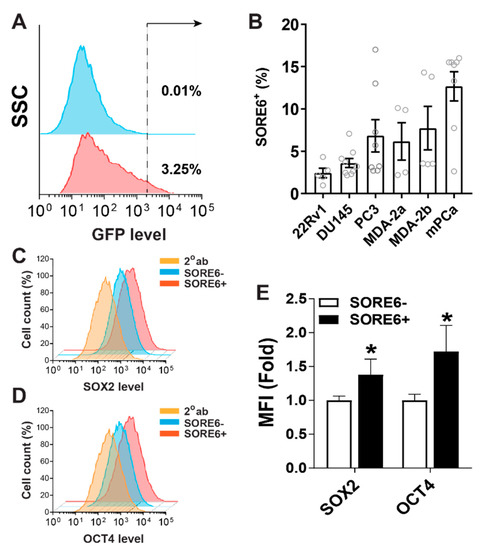 Similarly, in primary cells established from human (MDA-2a and MDA-2b) and mouse (mPCa) prostate cancers, SORE6+ sub-populations were identified (Figure 1B). The analysis of the SOX2 and OCT4 expression in PC3 cells showed that the SORE6+ cell population expressed more of these proteins than the SORE6− population did (Figure 1C,D), indicating that the SORE6 reporter can identify prostate cancer cells overexpressing SOX2 and OCT4.
