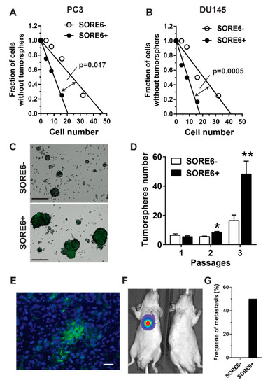 Increased self-renewal, tumorsphere- and metastasis-forming frequency in SORE6+ cells. SORE6+ and SORE6− cells were sorted from (A,C–F) PC3 and (B) DU145 cells and plated on (A,B) 96-well plates for limiting dilution assays, (C,D) 6-well plates for self-renewal and tumorsphere-forming assays, or (E–G) injected into mice via the left ventricle for metastasis-forming assays. (A,B) The plots of the PC3 (A) and DU145 tumorsphere formation (B). (C,D) The representative images and quantitative data of the PC3 cell tumorsphere formation on 6-well plates at various passages, scale bar: 200 μm *, ** p < 0.05 and 0.01 versus SORE6−, respectively, n = 3. (E) A representative fluorescence image of tumor sections prepared from tumors derived from SORE6+ PC3 cells, scale bar: 25 μm. (F,G) The formation of lung metastases in nude mice injected with SORE6+ PC3 cells. (F) Representative bioluminescence images and (G) quantitative data, of lung metastases are shown.
