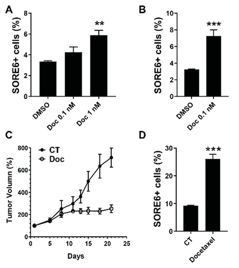 Compared to the bulk of tumor cells, CSCs are relatively resistant to chemotherapy [2,3]. To test if SORE6+ cells exhibited these properties, we tested their response to docetaxel. As shown in Figure 3A,B, the docetaxel treatment, which killed over 50% of all cells, caused a 2 to 3-fold enrichment in SORE6+ PC3 and DU145 cells, suggesting that they are relatively more resistant to chemotherapeutics than their SORE6− counterparts. In supporting this notion, the docetaxel treatment halted the growth of PC3 tumors in nude mice, but also caused the mice to generate tumors containing significantly more SORE6+ cells (from 10% to 25%; Figure 3C,D).