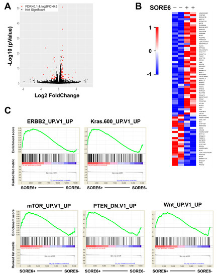 The transcriptome analysis of the altered gene expression in SORE6+ cells. (A,B) A volcano plot (A) and heatmap (B) show the genes differentially expressed between SORE6+ and SORE6− PC3 cells, with a log2 fold change ≥ 0.6 (linear 1.5-fold change) and FDR < 0.1. The differentially expressed genes are highlighted in red in the volcano plot. (C) The signaling pathways significantly enriched in SORE6+ cells were analyzed by GSEA, with adjusted p < 0.05 and FDR < 0.1.
