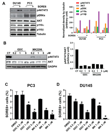 PI3K/AKT signaling is upregulated in SORE6+ cells. (A) The sorted SORE6+ and SORE6− PC3 and DU145 cells were analyzed by Western blotting for the expression of the indicated proteins. Left panel, representative images; right panel, densitometric analysis of the indicated protein expression normalized by tubulin. (B) The effect of the GDC0941 (GDC) and MK2206 treatments on AKT phosphorylation. Left panel, representative images; right panel, densitometric analysis of pAKT473 levels normalized by total AKT. The original blots for Figure 5A,B can be found in Figures S2 and S3. (C,D) The effect of the GDC0941 (GDC) and MK2206 treatments on the SORE6+ fraction in (C) PC3 and (D) DU145. * p < 0.05 versus DMSO, n = 3–4.