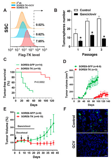 To determine the role of SOX2/OCT4-overexpressing CSCs in tumor initiation and recurrence, we used our SORE6 construct to express a suicide gene in PC3 cells. This lentiviral construct, SORE6-TK, expressed a suicide gene, the herpes simplex virus TK, under the control of the SORE6 promoter. TK-expressing cells are sensitive to GCV because TK converts GCV to GCV monophosphate, which is further converted to GCV triphosphate by the cancer cells’ enzymes, which in turn delays cell-cycle progression and induces cell apoptosis [26]. As expected, the treatment of PC3 cells with GCV specifically eliminated SORE6-TK+ cells and concordantly inhibited tumorsphere formation (Figure 6A,B), indicating the ablation of the CSC population in PC3 cells by GCV.