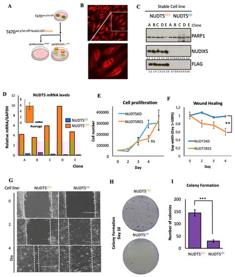 To ascertain whether NUDT5 is indeed driving a more aggressive cancer phenotype, we generated T47D breast cancer cells stably depleted of NUDT5, as well as the corresponding rescue cell lines. First, we used a Tet-Off system and specific shRNAs to generate stable cell lines, wherein the endogenous NUDT5 was over 95% depleted (NUDT5KD) (Figure 1A–C and Figure S1K). Using NUDT5KD cells and a pKAR plasmid [20] containing the Tet-Off driving, an shRNA resistant FLAG-tagged NUDT5 mutant rescue cell line was generated (NUDT5RES). An efficient rescue was reproducibly observed across several stable clones at both the protein and mRNA levels (Figure 1B–D).