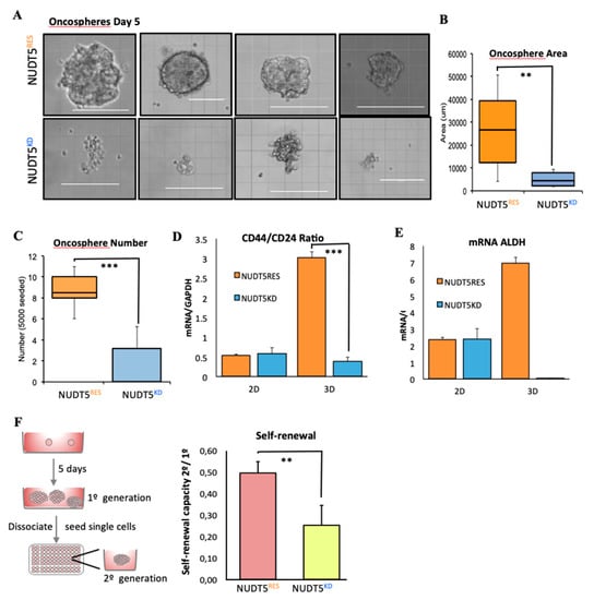 These observations led us to consider that NUDT5 had no effect on the cell cycle under normal growth conditions but could drive changes in the cancer cell phenotype, perhaps promoting an EMT and/or stem cell-like state. One experimental model used often for understanding these processes is growing the cancer cell lines in non-adherent conditions as three-dimensional (3D) oncospheres. During this process, the majority of seeded single cells die during the initial days of culture because of the challenge of growing in non-adherent surfaces [14], and the surviving cells express markers of EMT and stemness, and initiate the formation of spheres within 5–6 days [2,15].