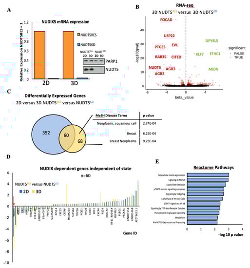 Gene expression changes induced specifically in 3D culture conditions depend on NUDT5. (A) Relative mRNA expression (normalised against GAPDH) of NUDT5 in NUDT5KD and NUDT5RES cell lines in 2D and 3D conditions, inset protein expression of NUDT5. Full western blot is found in Figure S3C. (B) Volcano plot from RNA-seq differential expression analysis comparing 3D-NUDT5KD and 3D-NUDT5RES cell lines. (C) Venn diagram showing the overlap between 2D and 3D analysis. Genes changed in 2D dependent on NUDT5 shown in blue (2D-NUDT5KD versus 2D-NUDT5RES) and genes changed in 3D dependent on NUDT5 in yellow (3D-NUDT5KD versus 3D-NUDT5RES). Enriched medical disease terms (MeSH) within the 3D specific data set are shown (right panel). (D) mRNA expression of 60 genes, which were dependent on NUDT5 at both the 2D and 3D states; NUDT5 is indicated by an arrow. (E) Reactome pathway analysis showing the significantly (p < 0.05) enriched pathways which were dependent on NUDT5 in 3D.