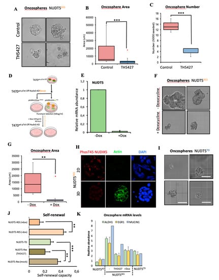 As TH5427 inhibits both the AMP- and ATP-generating activities of NUDT5, and no specific inhibitor targeting only the ATP-generating activities of NUDT5 was available, we took advantage of the Tet-Off cassette present within the NUDT5RES cells (Figure 5D). Treatment of these cells with doxycycline for 48 h induced the depletion of the FLAG-NUDT5 rescue mRNA and total protein levels (Figure 5E). NUDT5RES cells were grown as oncospheres for 2 days, prior to the doxycycline treatment for an additional 3 days, similar to the NUDT5KD cell lines (Figure 3A). This treatment resulted in phenotypically abnormal, significantly fewer and smaller oncospheres in general (Figure 5F,G and Figure S3E,F). The effect of NUDT5 inhibition on oncosphere growth was not limited to cells of breast origin but was observed in multiple cancer cell lines (BT474, HEK293T, U2OS, MNNG-HOS) grown as oncospheres (Figure S3G).