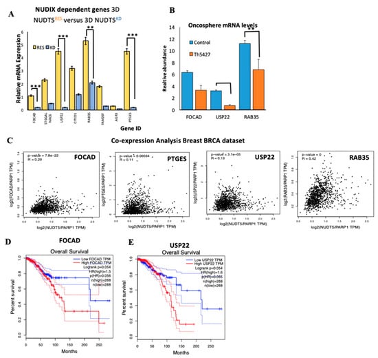 The oncosphere expression data (Figure 4C) not only provided insight into known CSC, EMT or tumour markers, but also identified novel NUDT5-dependent genes relevant for oncosphere growth. Therefore, we focused our attention on several of these genes based on the strong activation of their expression in the oncosphere, which was dependent on NUDT5 (Figure 6A). Prostagladin E synthase (PTGES) is known to be associated with an increased risk of breast cancer [46]; focadhesin (FOCAD) is a transmembrane protein of which very little is known, except a putative tumour suppressor role in gliomas [47]; the small GTPase RAB35B has putative oncogenic properties [48] and its inhibition reduces exosome release, tumour growth, CSC and metastasis [49]; the ubiquitin specific peptidase 22 (USP22) has been identified as 1 of 11 known “death from cancer” signature genes [50], promoting lethal tumour progression, being associated with end stage disease and CSC [51,52] and has gained interest as a cancer therapy target [53]. We validated the significant reduction in expression of some of these genes in oncospheres, following the inhibition of NUDT5 by qRT-PCR (Figure 6B). The co-expression correlation of NUDT5 with FOCAD, PTGES, USP22 and RAB35 was further explored using TGCA patient datasets in breast cancer and showed a significant correlation in all cases (Figure 6C). As these genes are regulated by NUDT5 and their expression patterns correlate in patients, we predicted that stratifying patients on the basis of the expression levels of the most NUDT5-dependent genes (FOCAD and USP22) would also predict a poorer patient outcome similar to that observed for NUDT5. This prediction was clearly confirmed in patient datasets (Figure 6D,E).