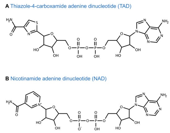 Tiazofurin is a prodrug and thus requires metabolic conversion intracellularly to its active metabolite thiazole-4-carboxamide adenine dinucleotide (TAD) in two sequential steps, as shown in Figure 5. TAD is an analogue of nicotinamide adenine dinucleotide (NAD) where nicotinamide is replaced by thiazole-4-carboxamide (Figure 6). TAD mimics NAD and interacts with the NAD cofactor binding domain of IMPDH 1 and 2 by acting as a non-competitive inhibitor [98,99,100,101]. Given that TAD is very similar to NAD (Figure 6), it is highly likely that the other NAD-dependent enzymes are affected by TAD. TAD is metabolically unstable and is degraded by nicotinamide mononucleotide adenylyltransferase (NMNATase), a phosphodiesterase. Resistance to tiazofurin is primarily associated with a decrease in NMNAT activity [92,101,102,103].