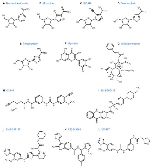 The development of tiazofurin as an anti-leukemia drug expanded the areas of clinical application of IMPDH inhibitors. Vertex Pharmaceuticals, Inc. developed a novel series of human IMPDH inhibitors that were structurally distinct from mycophenolic acid and nucleoside analogues [133]. Merimepodib (VX-497) (Figure 7L) was the lead compound developed in this series, and displayed immunosuppressive, anti-tumor, and anti-viral activity. As an immunosuppressive agent, it inhibited antibody production in vivo, as demonstrated by the murine plaque formation assay [134]. It had anti-proliferative activity against keratinocytes suggesting a possible role in the treatment of psoriasis [134]. VX-497 had broad spectrum anti-viral activity and was 10-100 times more potent than ribavirin against Hepatitis B, human cytomegalovirus, respiratory syncytial virus, and herpes simples virus [135]. More recently, VX-497 was found to be active against several globally emerging viruses like Zika virus and Ebola virus [136] reaching to Phase II trials for Hepatitis C and psoriasis [137], and displaying anti-tumor activity in vitro (Table 4).