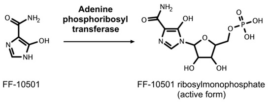 Activation of FF-10501. FF-10501 is metabolized intracellularly to its active form, FF-10501 ribosylmonophosphate (RMP), which inhibits IMPDH.