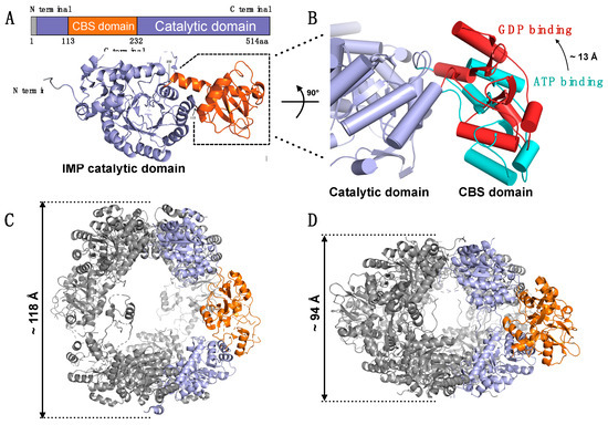 Supporting evidence of this concept was reported by Dr. Buey et al. with the discovery of GTP-binding sites within the CBS domains of fungal IMPDH, which lead to octamerization of the enzyme and subsequent inhibition of activity [224]. The inhibitory effect of GTP was also observed in human IMPDH1 and IMPDH2 [224]. This data suggests a form of negative feedback involving IMPDH, where the end-product GTP inhibits the biosynthesis of GTP through inhibition of IMPDH. In a subsequent series of studies, Dr. Buey’s group further revealed that the CBS domain of IMPDH can bind to three GTP/GDP molecules, including two that bind to a similar pocket to ATP. However, the third GDP molecule binds to the loop between the second CBS domain and the catalytic domain. GDP binding at this site causes rotation in the CBS domain and structural rearrangement of the catalytic domain (Figure 9B). This structural change significantly affects the enzyme conformation, which forms an inhibited conformation, as compared to the ATP-induced active form [225]. Thus, interaction with GTP/GDP decreases the flexibility of the CBS domain, and the activity of IMPDH is suppressed by forming a compact structure (Figure 9C,D).