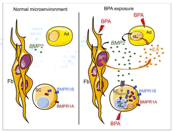 - Clement, F.; Xu, X.; Donini, C.F.; Clement, A.; Omarjee, S.; Delay, E.; Treilleux, I.; Fervers, B.; Le Romancer, M.; Cohen, P.A.; et al. Long-term exposure to bisphenol A or benzo(a)pyrene alters the fate of human mammary epithelial stem cells in response to BMP2 and BMP4, by pre-activating BMP signaling. Cell Death Differ. 2017, 24, 155–166. [Google Scholar] [CrossRef] [PubMed]